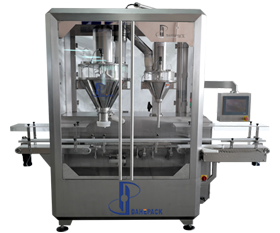 該機是一款經濟實用的粉末及小顆粒自動灌裝機,能完成瓶子自動定位、充填及計量等工作,它由一台雙充填螺杆計量機、一台雙排鏈板輸送帶及兩個氣動定位裝置組成,可與理瓶機、旋蓋機、貼標機等組成整套灌裝流水線。適用於包裝粉末、小顆粒藥品、奶粉、獸藥、調味品、粉粒狀添加濟、葡萄糖、固體飲料、爽身粉、農藥等。